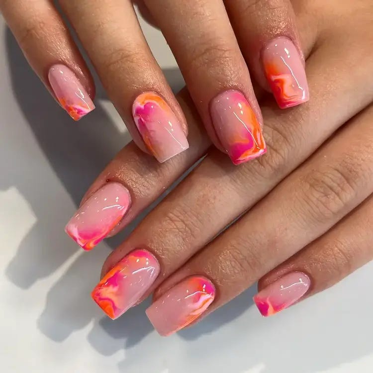This design captures the breathtaking beauty of a summer sunset, with warm swirls of pink and orange dancing across each nail. It’s ideal for anyone looking to wear a piece of the sunset’s romance on their fingertips.